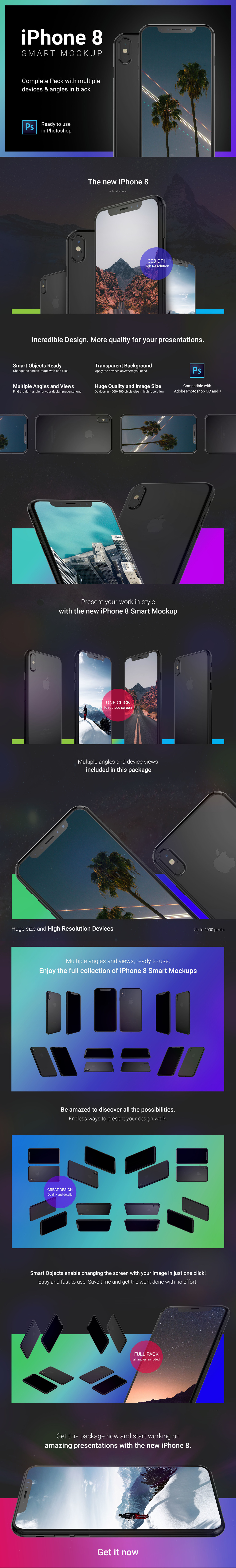 This is a Smart Mockups package with iPhone 8 Mockups - Full Package Ready for Photoshop You can easily change the screen image in any device and any angle included with a single click. (Read how to use below, it's super easy!)